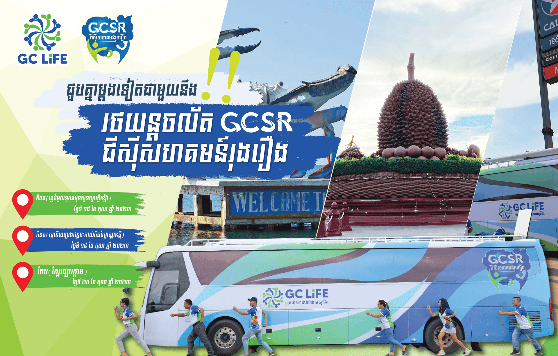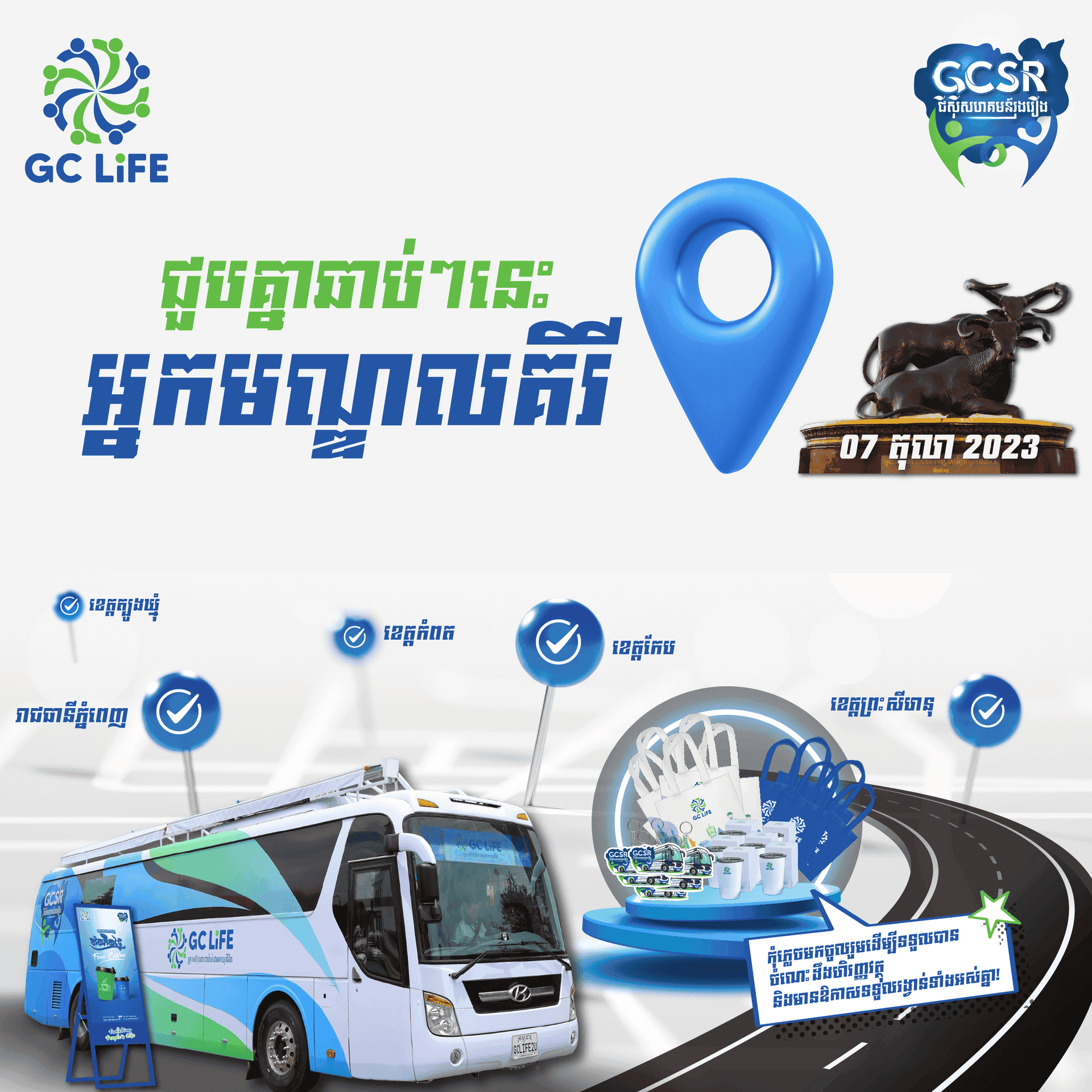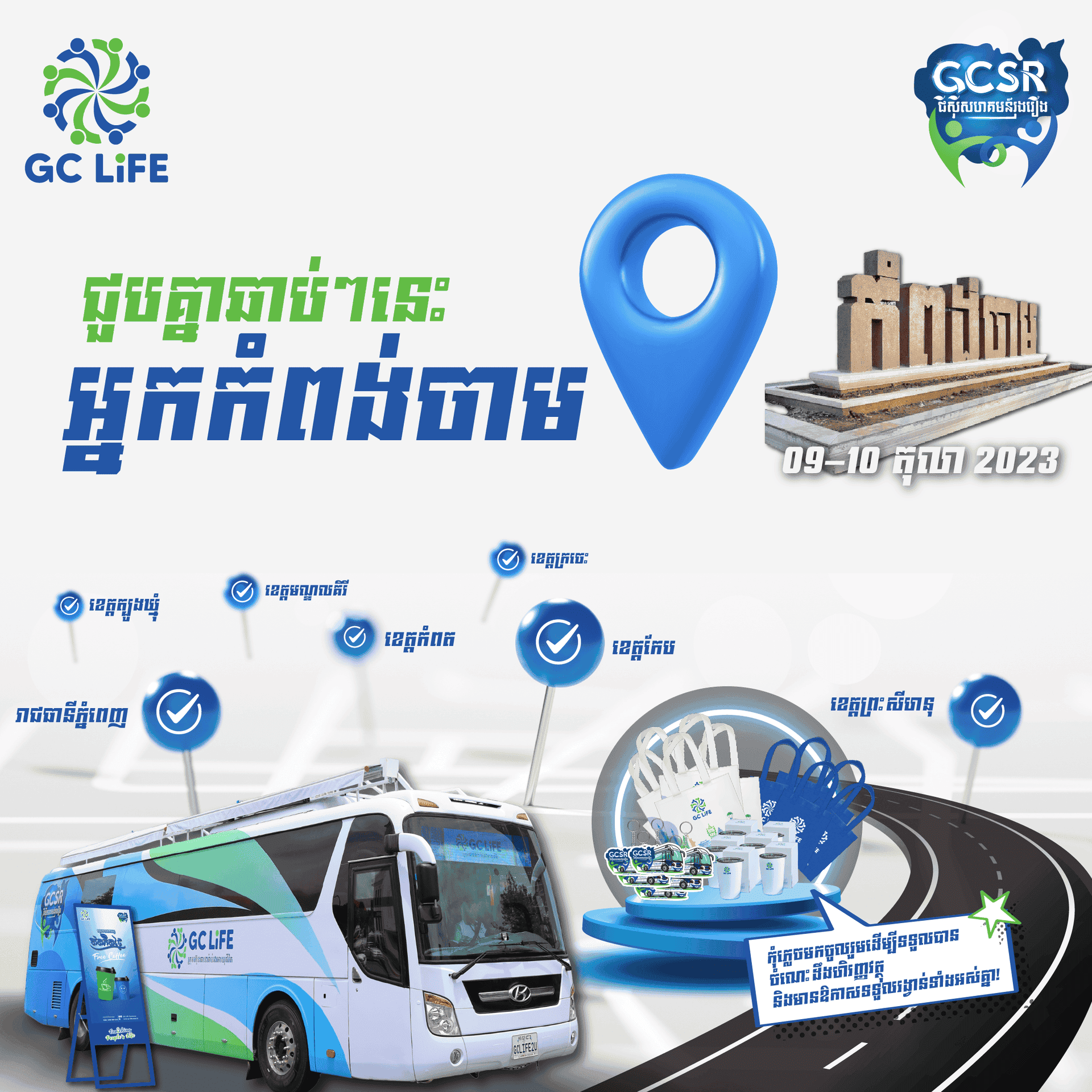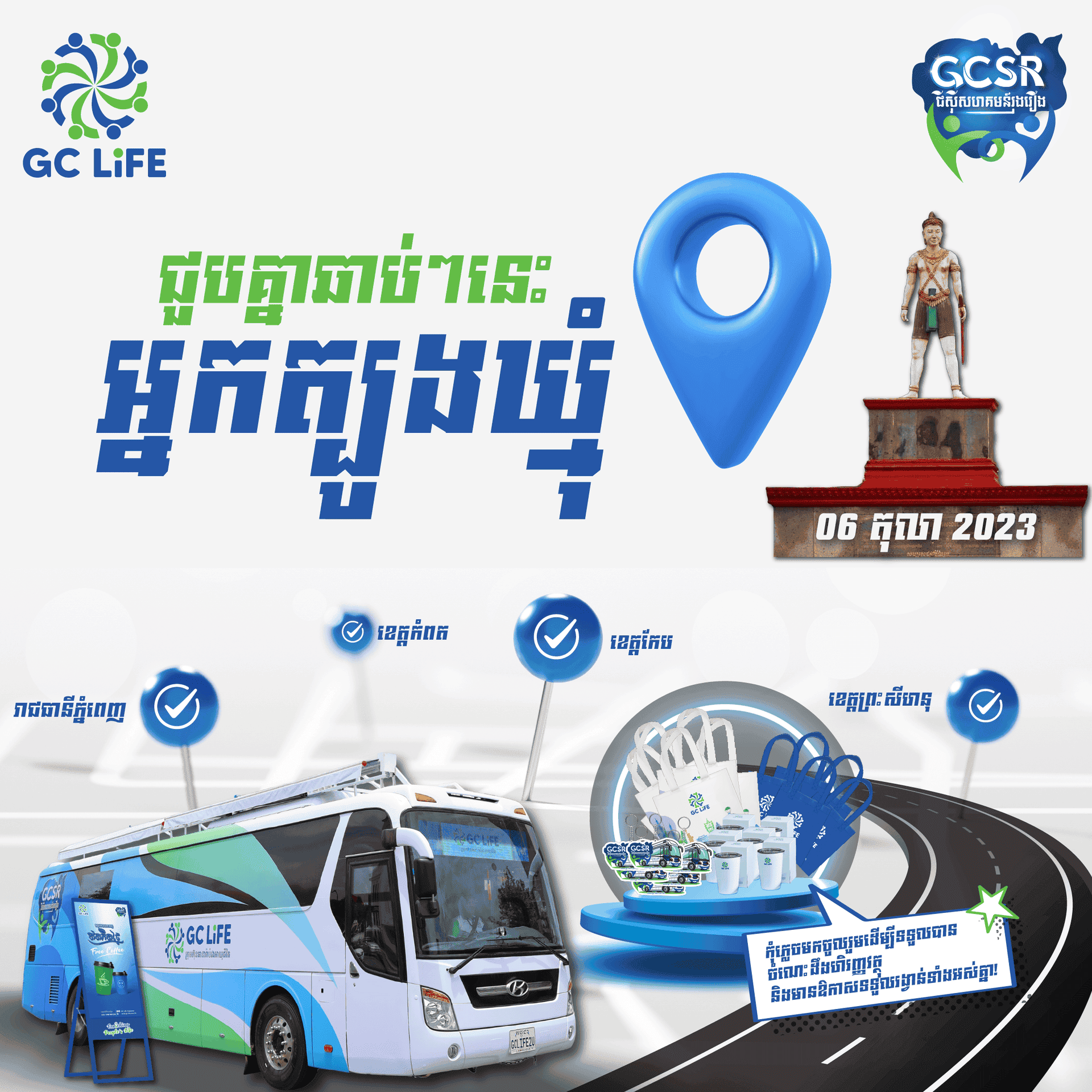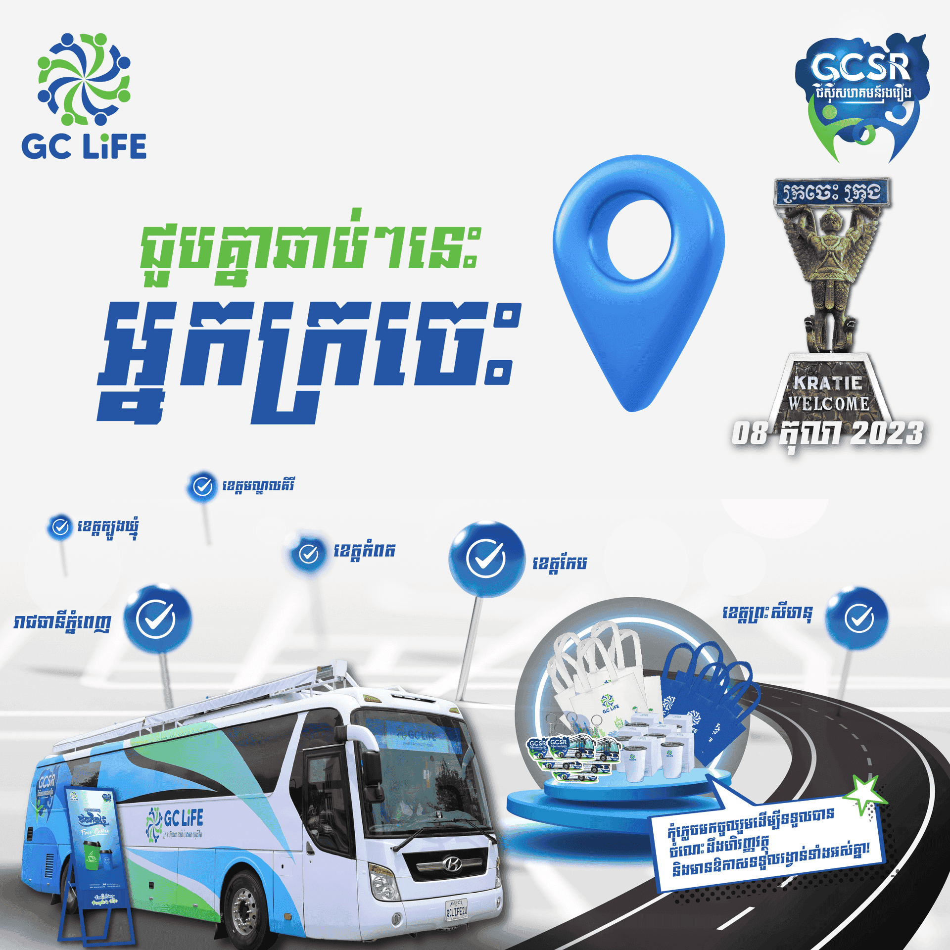 រថយន្តចល័ត GCSR របស់ក្រុមហ៊ុនធានារ៉ាប់រងអាយុជីវិត GC Life បានពាំនាំចំណេះដឹងផ្នែកហិរញ្ញវត្ថុ និងធានារ៉ាប់រង ព្រមទាំងសកម្មភាពកម្សាន្តជាច្រើនទៅកាន់ប្រជាពលរដ្ឋនៅតាមបណ្ដាលខេត្តខាងលើ។