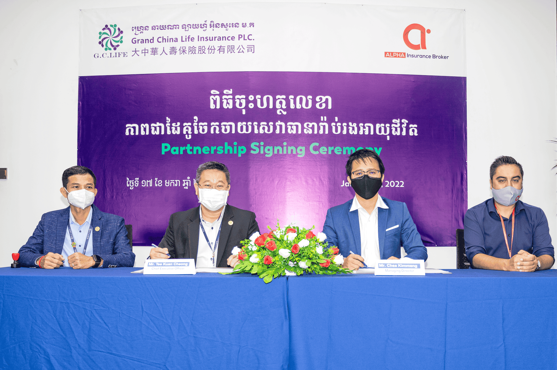 នៅថ្ងៃច័ន្ទ ទី ១៧ ខែ មករា ឆ្នាំ ២០២២ នេះ ក្រុមហ៊ុនធានារ៉ាប់រងអាយុជីវិត GC Life បានចុះហត្ថលេខាភាពជាដៃគូផ្លូវការជាមួយក្រុមហ៊ុន ALPHA Insurance Brokers Cambodia ដើម្បីផ្ដល់នូវផលិតផលធានារ៉ាប់រងអាយុជីវិតដល់ប្រជាពលរដ្ឋទូទាំងប្រទេសកម្ពុជា។ យើងពិតជាមានកិត្តិយស និងសេចក្តីសោមន្សរីករាយក្នុងការចាប់ដៃគូជាមួយក្រុមហ៊ុន ALPHA ដើម្បីជួយដល់ប្រជាពលរដ្ឋទាំងឡាយសម្រេចនូវក្តីសុបិនរបស់ខ្លួន ដោយក្លាយជាផ្នែកមួយនៃផែនការហិរញ្ញវត្ថុរបស់ពួកគេ។